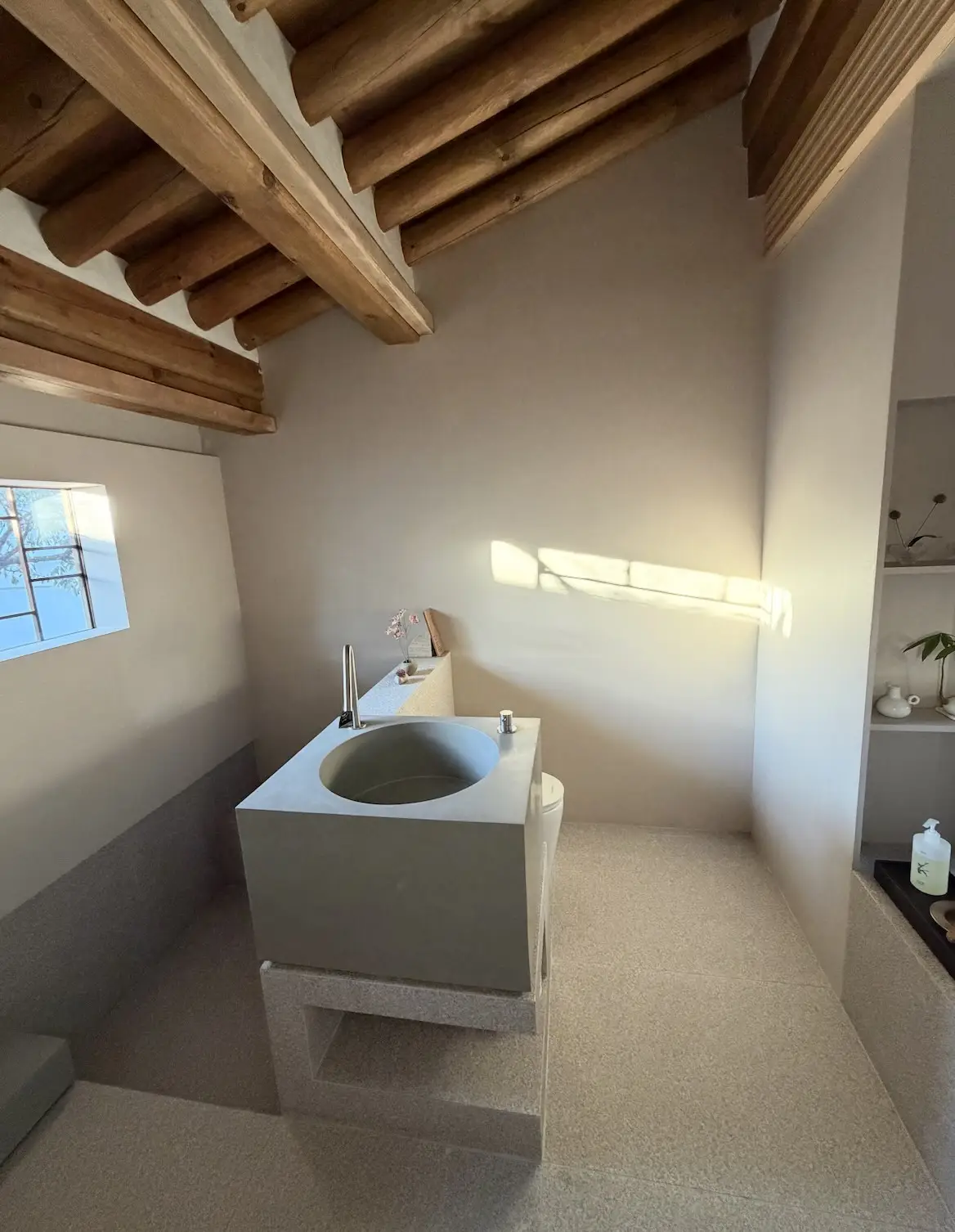 Le système de chauffage par le sol permet une douceur très agréable même en plein hiver. La maison est d’ailleurs découpée en 3 espaces et il faut passer par l’extérieur pour aller de l’un à l’autre. La salle de déjeuner est magnifique, avec une grande table en bois familiale. Une grande salle de bain s’ouvre sur un spa qui donne sur la montagne. Le soir, c’est un délice pour les visiteurs du lieu. Mon frère y a passé tout son séjour.
